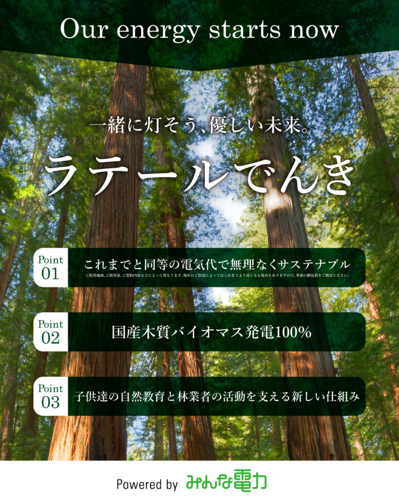 森を壊さない、森を育む再エネ電力、100%国産木質バイオマス由来の「ラテールでんき」の、法人向け提供を開始いたします。